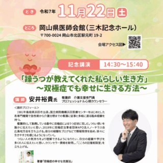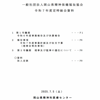 令和7年度 岡山県精神保健福祉大会が開催されるのでご案内いたします。 『「躁うつが教えてくれた私らしい生き方」~双極症でも幸せに生きる方法~』をテーマに、記念講演も開かれます。 PDFを印刷していただき、広報などにご利用 […] - 令和7年度 一般社団法人 岡山県精神保健福祉協会 定時総会資料